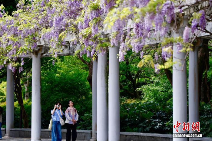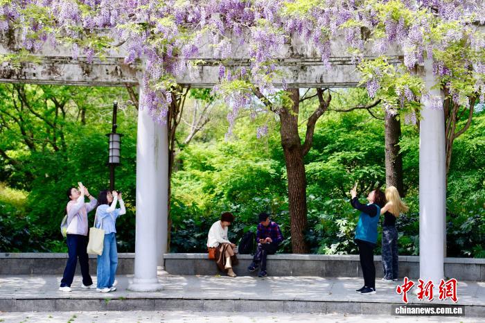 4月9日,浙江杭州,游人挨卡紫藤花。今天,杭州花园内乱紫藤花衰搁,引游人挨卡。中新社记者 肖健 摄