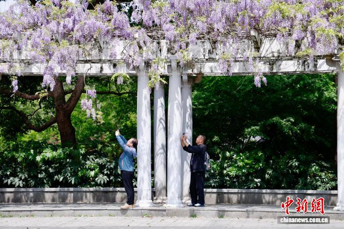 4月9日,浙江杭州,游人挨卡紫藤花。今天,杭州花园内乱紫藤花衰搁,引游人挨卡。中新社记者 肖健 摄